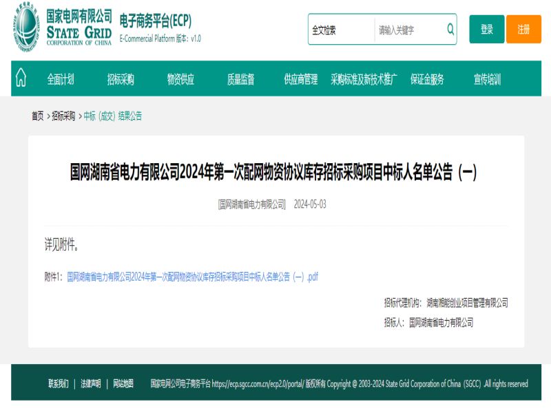 2024年5月3日,湖南省电力有限公司2024年第一次配网物资协议库存招标采购,