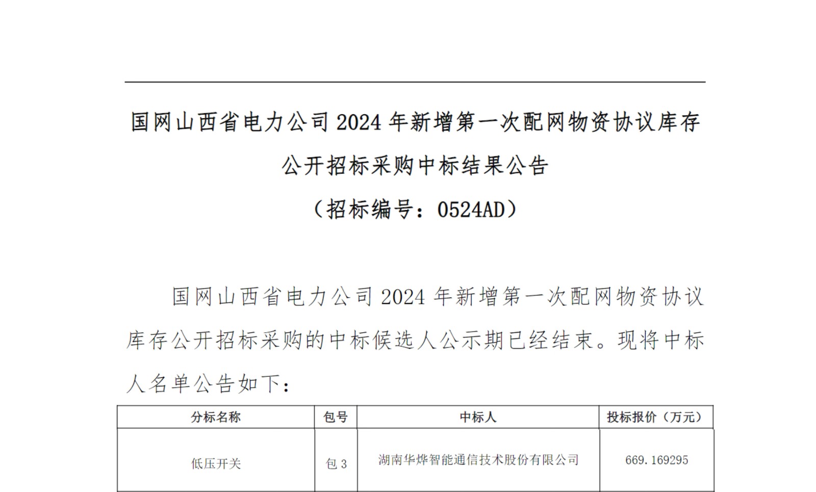 【中标喜讯】华烨智能中标国网山西省电力公司2024年新增第一次配网物资协议库存公开招标采购