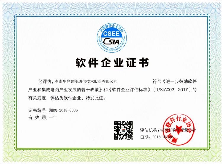 2017年6月我司被湖南省软件行业协会评估为软件企业。