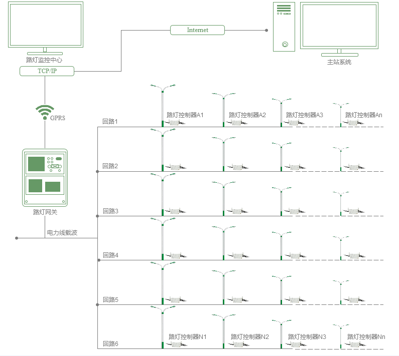 具进行控制,远程控制灯具的开关、检测灯具的工作状态,可以对城市的路灯实施统一启闭,对夜间照明系统和路灯的适时